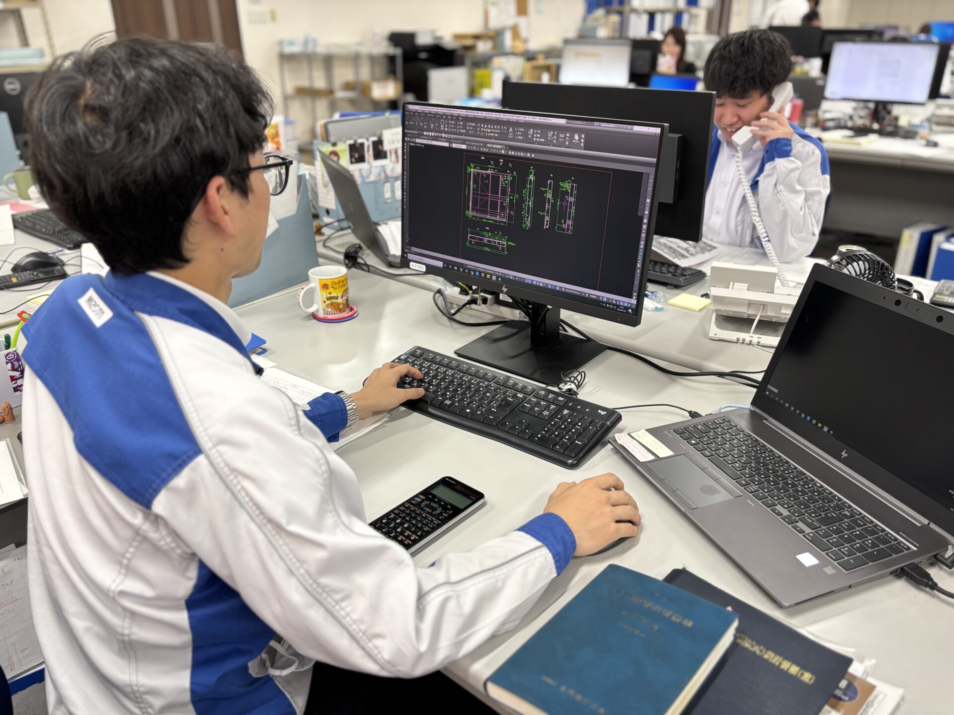 客先から入手した資料等を確認しながら図面について、詳細を検討。不明点は先輩社員や上司に相談する。