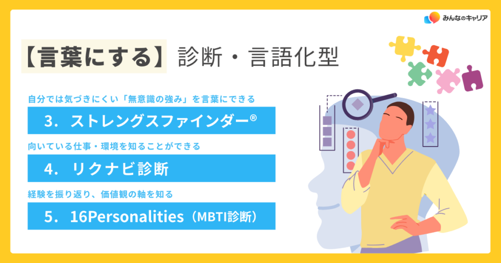 主なツール:ストレングスファインダー®、リクナビ診断、16Personalities(MBTI)など