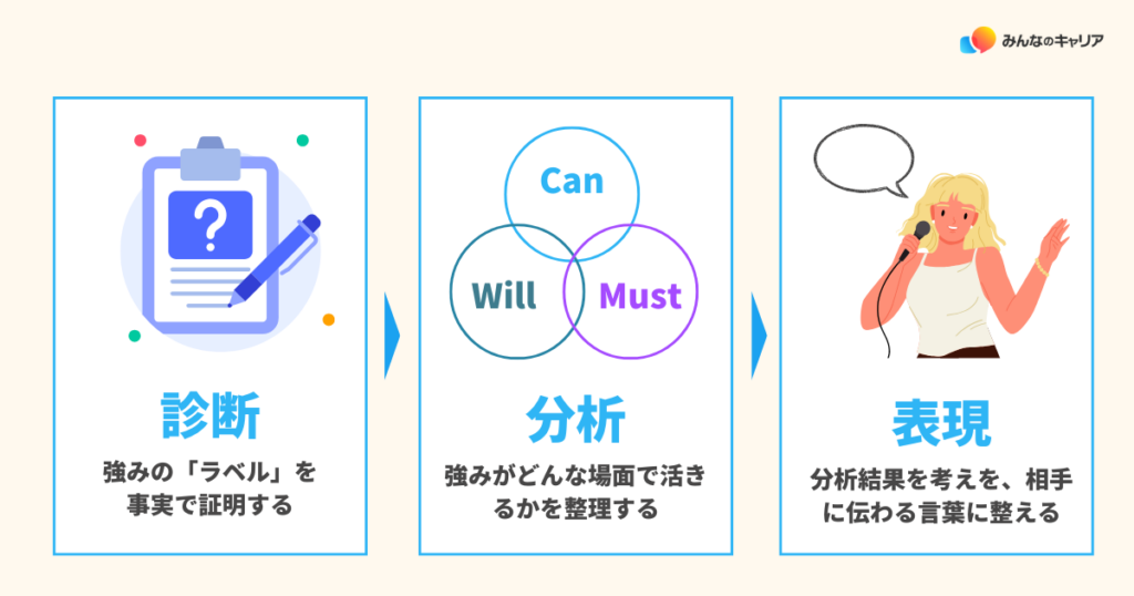 この3つの視点で分けて考えると、自分の強みを企業ごとにどう伝えるかが整理しやすくなります。