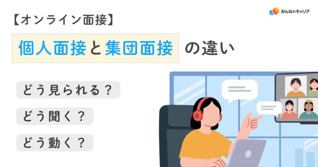 オンライン面接には、面接官と1対1で行う「個人面接」と、複数の学生が同時に受ける「集団面接(グループ面接)」があります。それぞれ求められる振る舞いが少し異なります。