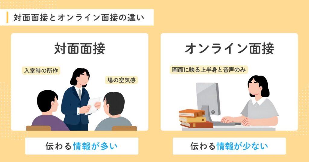 面接であることには変わりませんが、対面とオンラインでは、相手に伝わる情報の種類が大きく異なります。