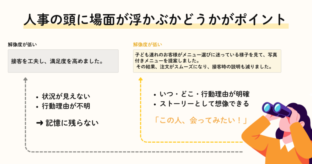 【解像度が低い例】 「アルバイト先で接客を改善し、お客様の満足度を高めました」