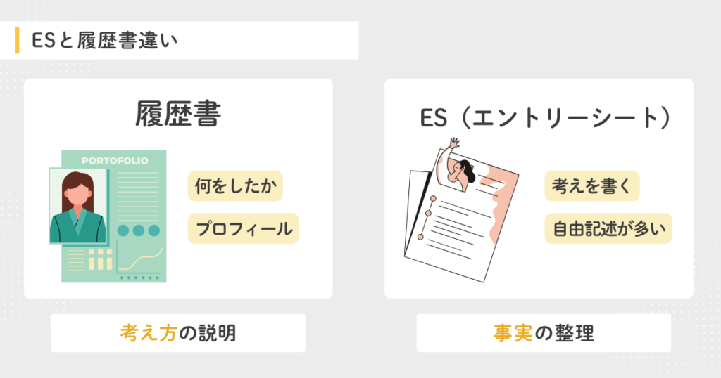 一方、ESは、その経験を通してあなたがどう考え、何を学び、どう成長したかを伝える場です。つまり、事実に対するあなたの解釈や意味づけを書くのがESです。