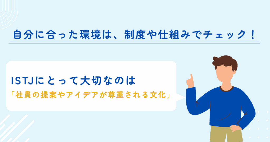 大企業はルールや専門職コースが整っていることが多く、中小企業でも専門性が重視される企業ではISTJ型の強みが活きやすいです。