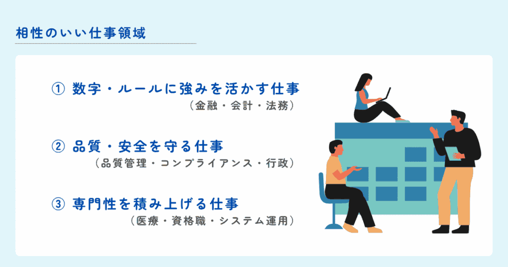 そのため、システムの保守・運用や物流管理、オペレーション全般など、確実に回し続けることが求められる仕事との相性は良い傾向があります。
