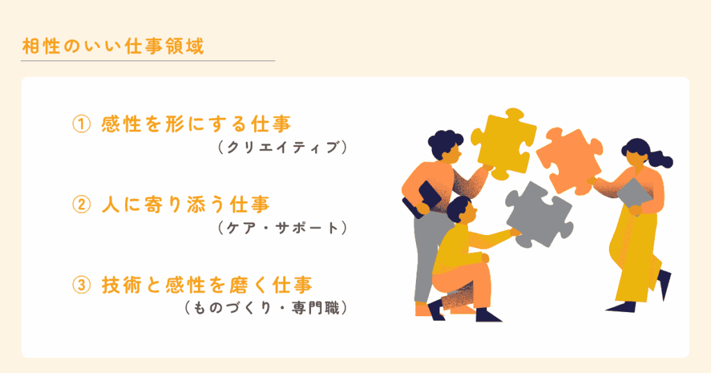 そのため、看護師・保育士・介護士など、人に直接寄り添うケア・サポートの仕事とは相性が良い傾向があります。