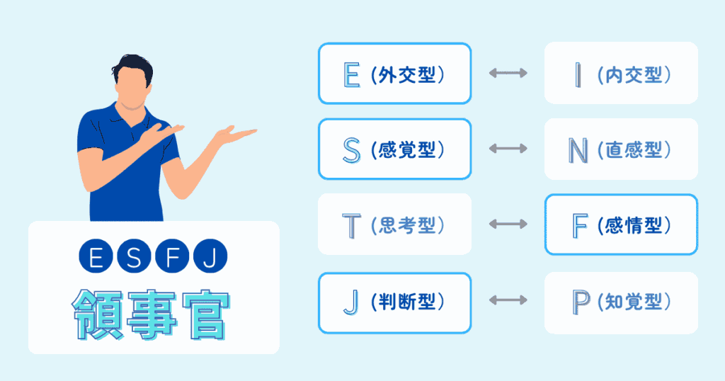 MBTI診断におけるESFJ型(領事官)は、外向的(E)・感覚的(S)・感情的(F)・判断的(J)という4つの特性を持つ、MBTIの16タイプの中でも特に人への思いやりと責任感が強いタイプです。