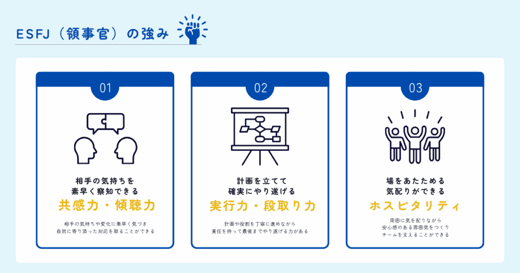 チームの雰囲気を整え、一人ひとりのコンディションに気を配れるESFJ型(領事官)。