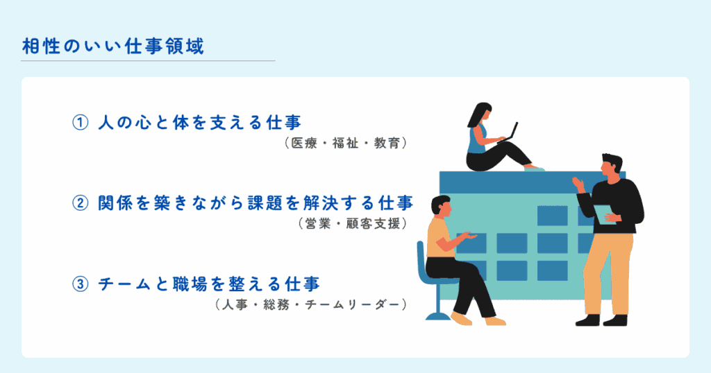 顧客対応やチームケアなど、「人の気持ちを理解して動く」場面で力を発揮しやすく、信頼される存在になれることが多いです。