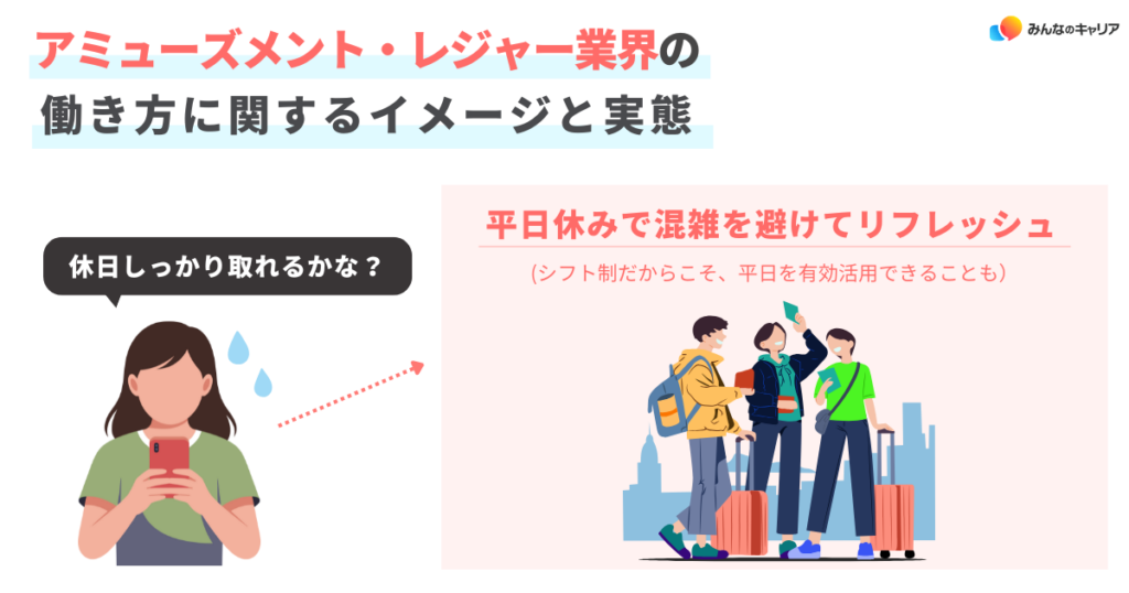 アミューズメント・レジャー業界は「人を楽しませる仕事」という魅力がある一方で、働き方に対して不安を感じる学生も少なくありません。「体力的にきつそう」「土日休めないのでは?」などのイメージが先行しがちです。ここでは、働き方に関する代表的な不安と、その実態について整理していきます。