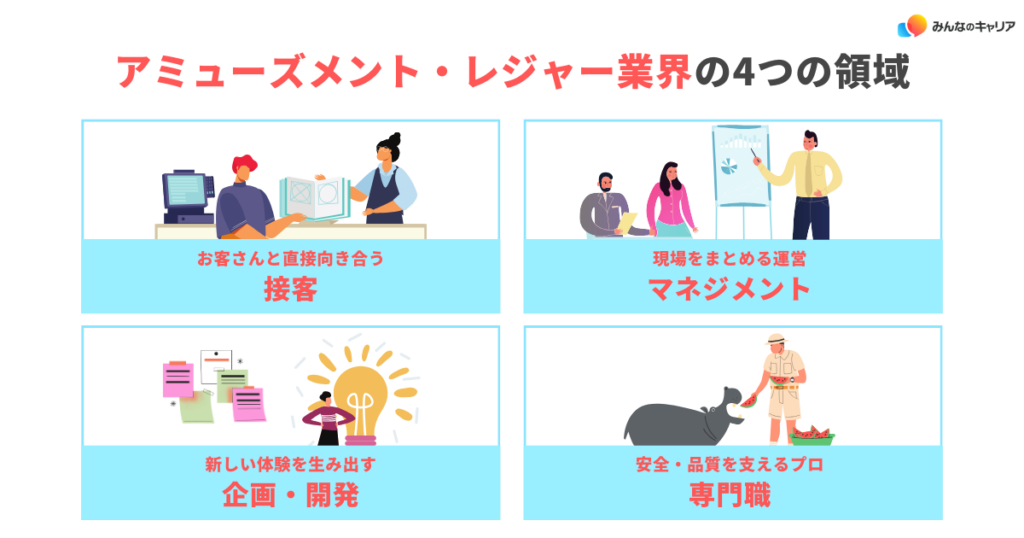 ここでは、アミューズメント・レジャー業界の仕事領域を4つに分けて紹介します。