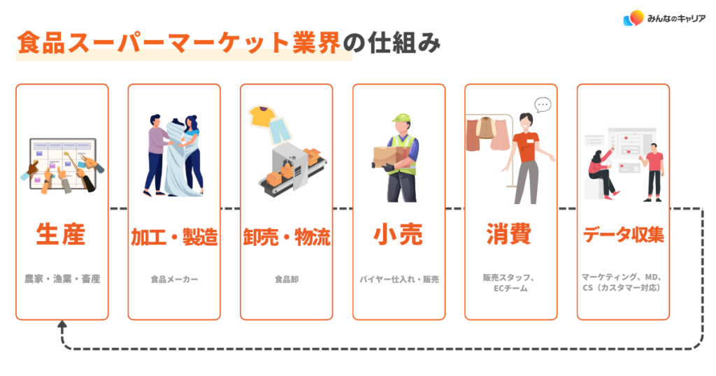 この記事では、食品スーパーマーケット(SM)業界の仕組み、業務内容や身につくスキルを解説します。