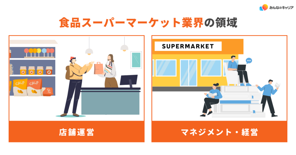 ここでは、食品スーパーマーケット業界における主な職種と領域を整理して見ていきましょう。