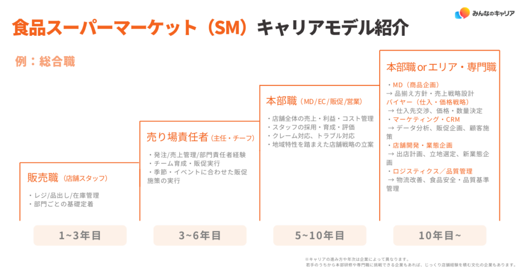 しかし実際には、商品の鮮度や売場づくりを担う店舗部門から、複数店舗を統括するマネジメント職、仕入れや戦略を担う本部職まで、さまざまな役割の仕事が存在します。