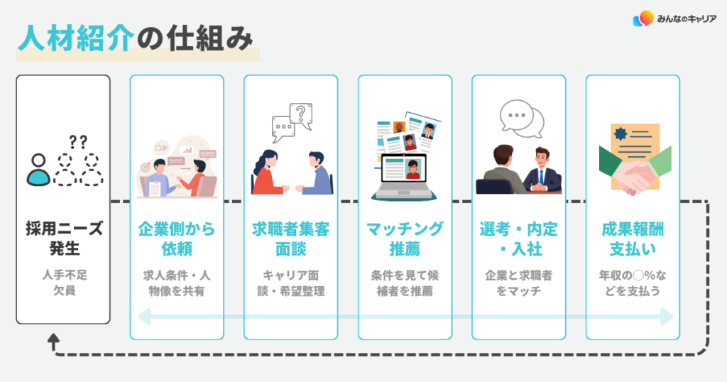 人材紹介業界とは、採用を行う企業と、就職・転職を考える人の間に立ち、双方をつなぐ仕事 です。 企業から「こんな人に来てほしい」という依頼を受け、その条件に合う人材を紹介し、採用が決まった際に報酬を得る仕組みになっています。