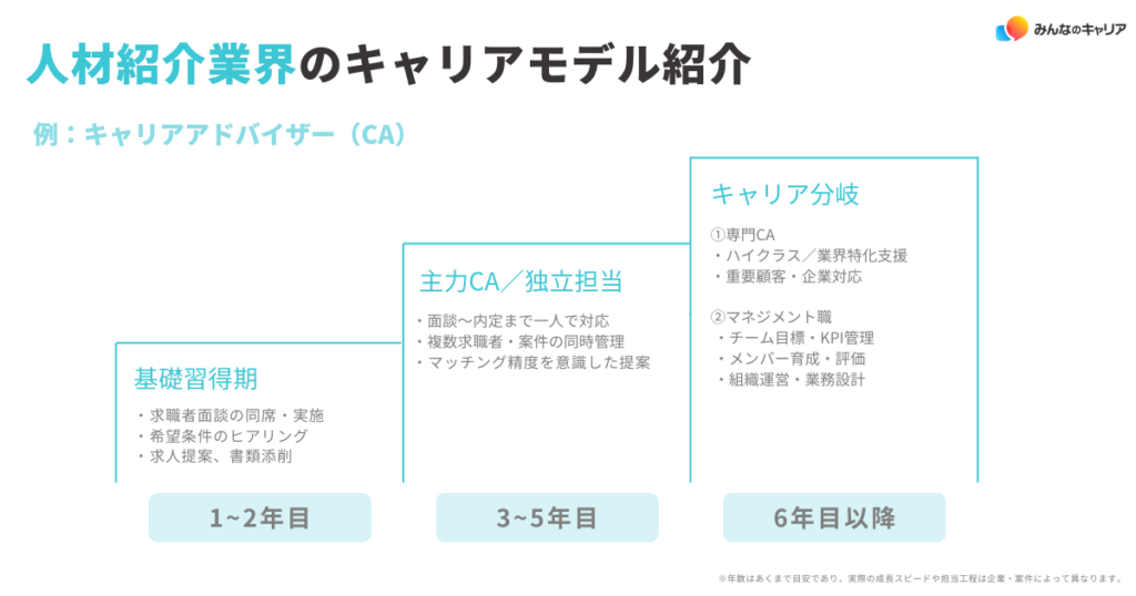 人材紹介業界では、まず求職者と向き合う現場業務を通じて、ヒアリング力や提案力といったキャリア支援の基礎を身につけるところからスタートするのが一般的です。 面談や求人提案を通じて、求職者の条件と企業要件を整理し、適切にマッチングする力を身につけていきます。 経験を積むにつれて、より難易度の高いマッチングや企業との調整にも関わるようになり、支援の幅と裁量が広がっていきます。企業や領域に特化した支援を任されるケースもあります。 その先のキャリアは一つではなく、専門性を深めてCAとして活躍し続ける道や、マネジメントに関わる道などさまざまです。