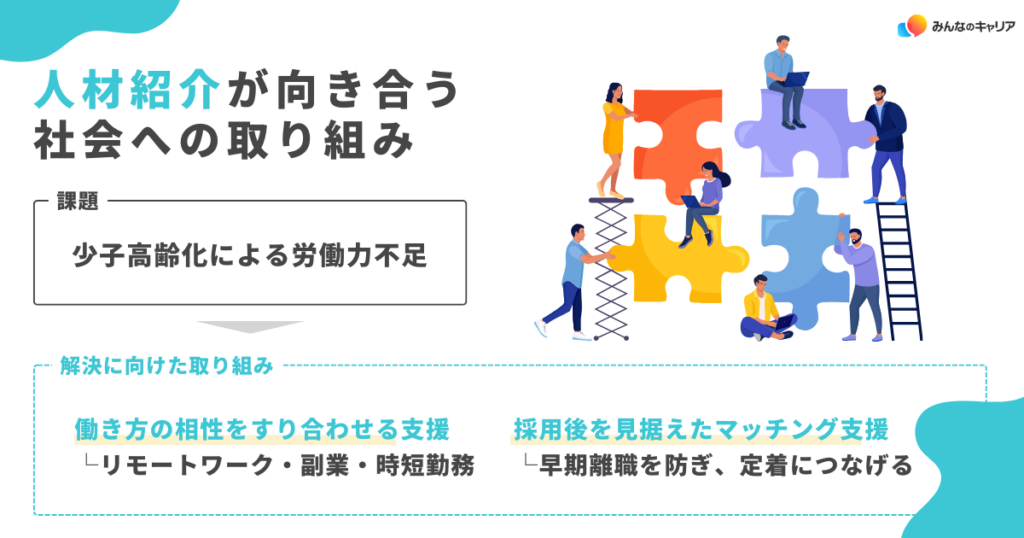 さらにここ数年で、リモートワークや副業、時短勤務、フリーランスなど、働き方の選択肢が一気に広がりました。その影響で、「正社員としてフルタイムで働ける人」だけを前提にした採用では、企業側も人材を確保しにくくなっています。 人材紹介の現場でも、条件だけでなく働き方の相性をすり合わせる役割 が、より重要になっています。
