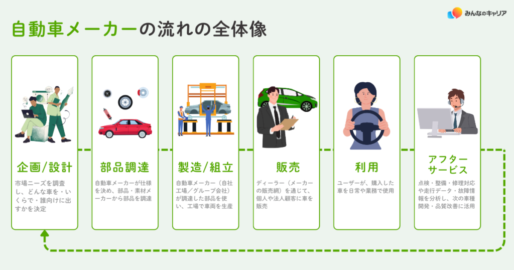 自動車メーカー業界は、企画、技術開発、生産、品質管理、調達、販売、アフターサービスといった複数の工程が連携して成り立っています。