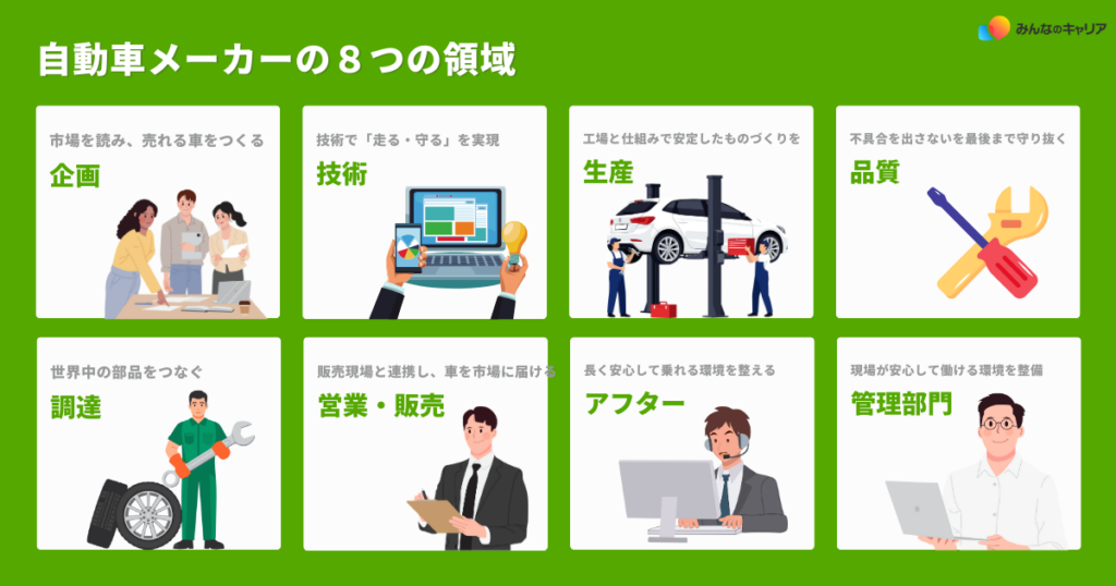 自動車メーカーの仕事は、開発・設計だけでなく、企画、生産、品質管理、調達、営業、アフターサービスなど多岐にわたります。ここでは、完成車メーカーで働くうえで中心となる8つの主要領域を紹介します。