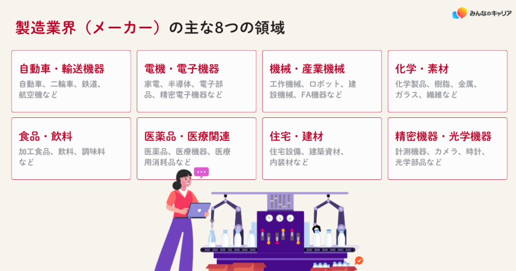 鉄鋼や化学といった素材メーカー、電子部品や精密機器部品を作る加工メーカー、自動車や家電といった最終製品メーカーまで、多様な企業が存在します。